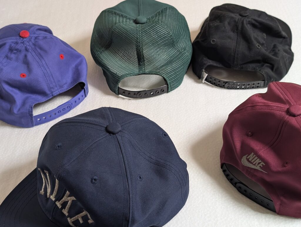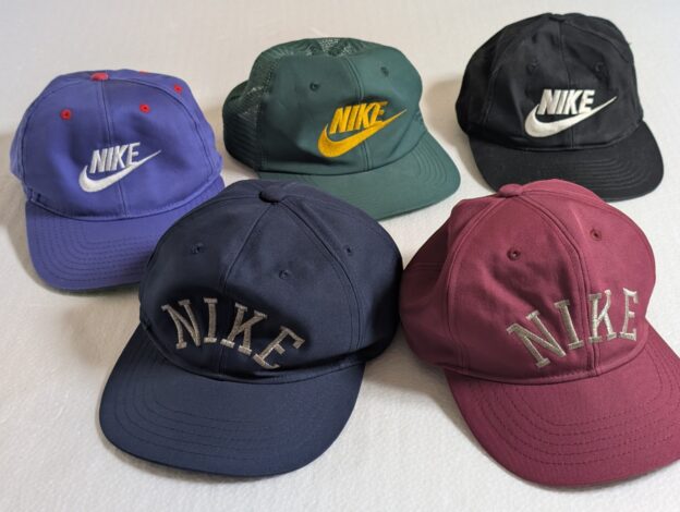 手前の紺色キャップは【NIKE COLLECTION】”ナイキ好きが語る”コレクション紹介!!!の動画で紹介されています。銀色刺繍のロゴとシルエットが素敵だと絶賛されています。是非、復刻してほしい商品です!