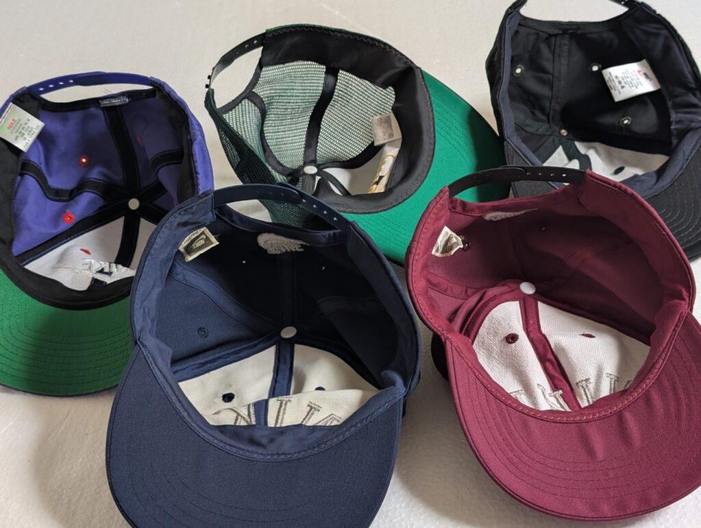 90年代NIKEキャップを探すと状態の良いモノが減っていきていると思います。さらに古い80年代の物は全く見つかりません。ナイキクロニクルに掲載されている「3連ロゴのメッシュキャップ」を探していましたが(今も探している?)全く見つからないので、死ぬ前には一度お目にかかりたいと思っています。90年代以降のメッシュキャップ自体が少ないので、少しでも気になったらゲットすべきだと思います。画像にもある緑のメッシュキャップもありそうでなかった…